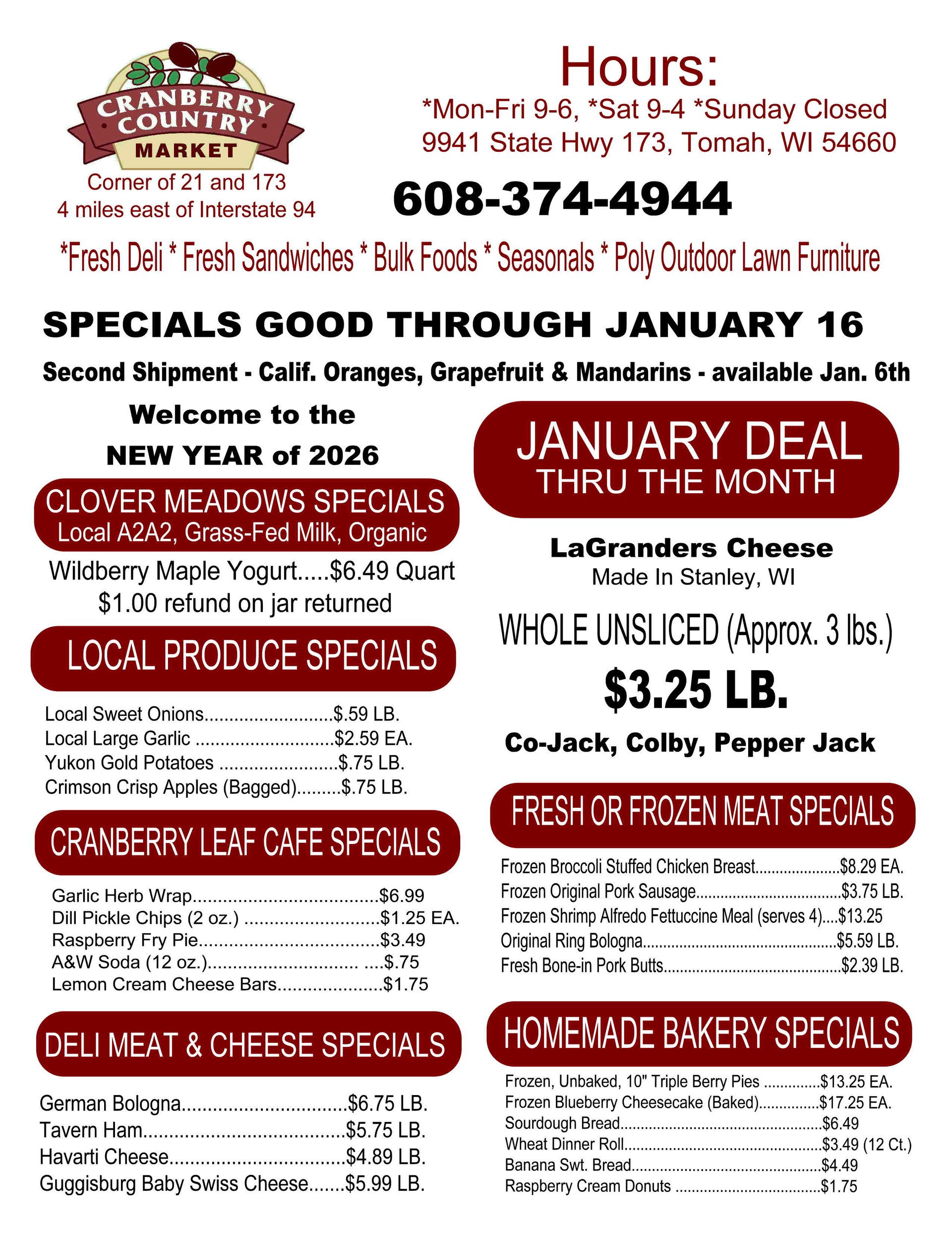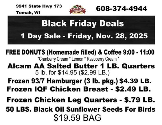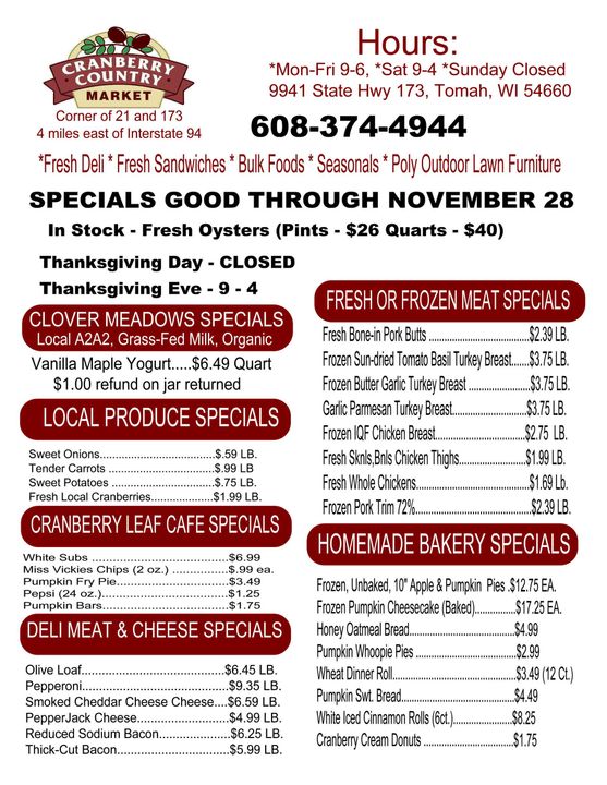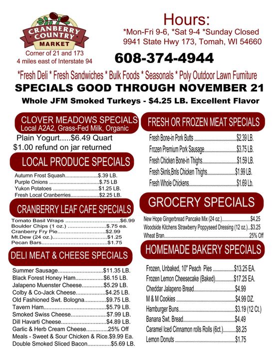 Cranberry Country Market is a locally owned and operated market in Tomah. We work hard to provide a family friendly shopping atmosphere with quality foods available. You'll enjoy our weekly specials and local produce. Our goal is to provide you and your family with fresh produce and meats at affordable prices. Stop by today and have a look around our market!