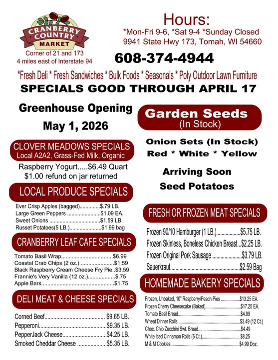Cranberry Country Market is a locally owned and operated market in Tomah. We work hard to provide a family friendly shopping atmosphere with quality foods available. You'll enjoy our weekly specials and local produce. Our goal is to provide you and your family with fresh produce and meats at affordable prices. Stop by today and have a look around our market!