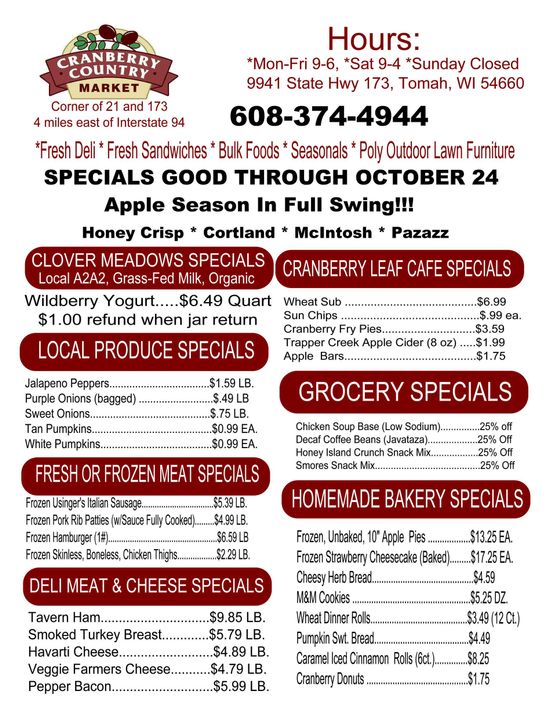 Cranberry Country Market is a locally owned and operated market in Tomah. We work hard to provide a family friendly shopping atmosphere with quality foods available. You'll enjoy our weekly specials and local produce. Our goal is to provide you and your family with fresh produce and meats at affordable prices. Stop by today and have a look around our market!