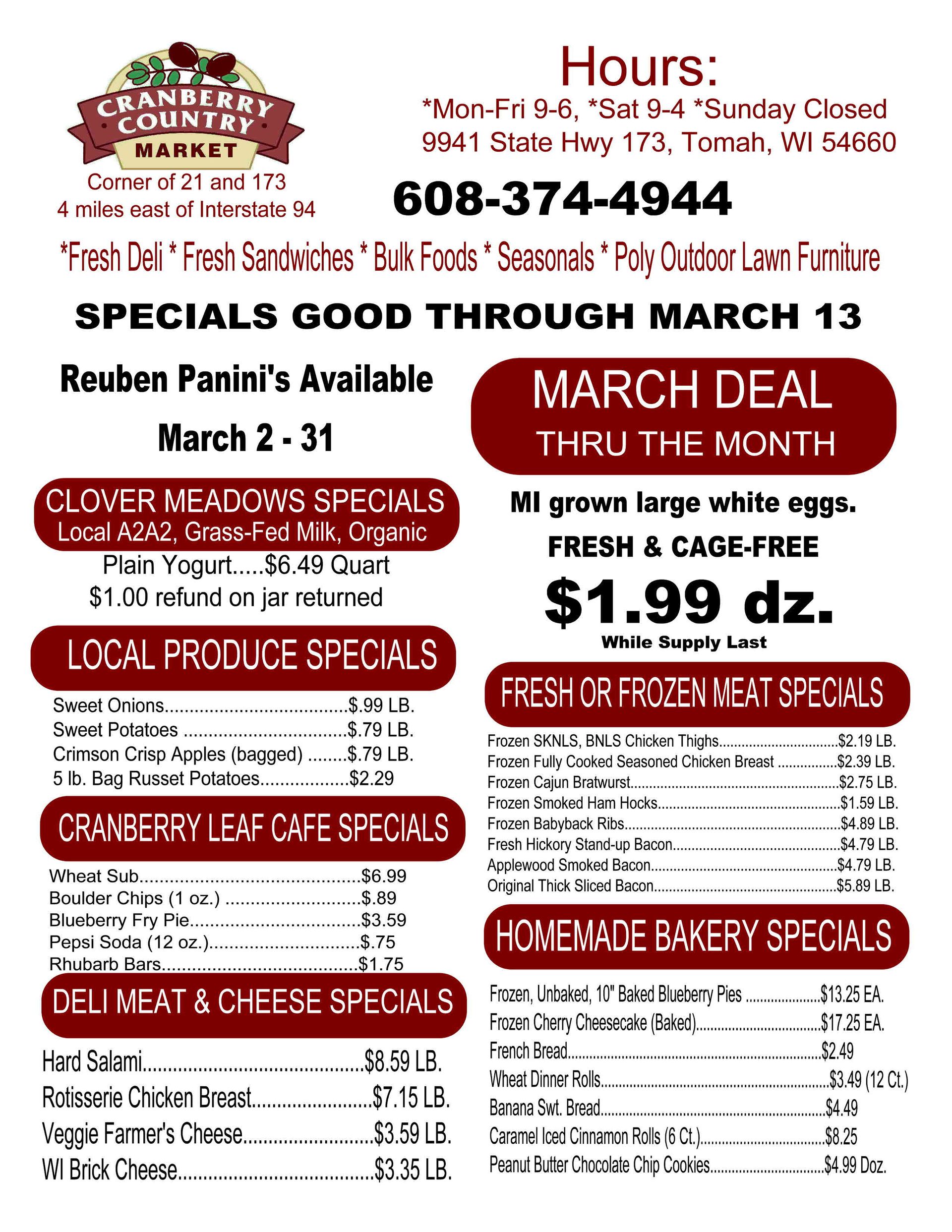 Cranberry Country Market is a locally owned and operated market in Tomah. We work hard to provide a family friendly shopping atmosphere with quality foods available. You'll enjoy our weekly specials and local produce. Our goal is to provide you and your family with fresh produce and meats at affordable prices. Stop by today and have a look around our market!